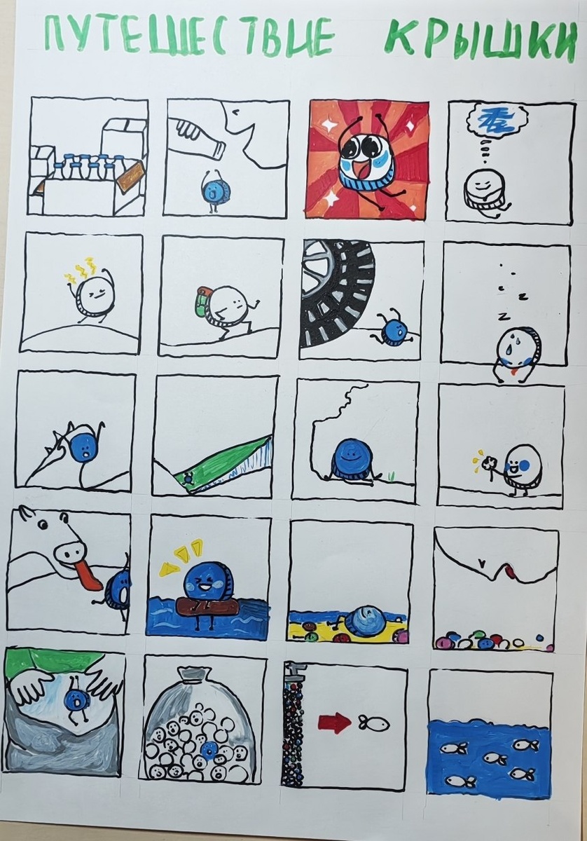 » Творческая работа №1 Автор: Ковалев Тимофей, 8 лет. Учебное заведение: МОУ лицей №7. Описание мини-комикса: Человек покупая продукты просто выбрасывает крышку. Ветер подхватывает и уносит ее. Крышка строит планы о путешествии. Попадает на оживленную улицу и чуть не попадает под колеса автомобиля. Испуганная она, попадает на природу. Любопытное животное чуть не съедает ее. Крышка попадает в воду, поток воды несет ее по реке. Вода выбрасывает крышку на берег, где уже лежат другие крышки, образуя свалку. Свалку обнаруживает человек, неравнодушный к экологии, собирает, сдает в переработку. А на собранные от переработки средства выпускают Мальков рыб. Восстанавливая экосистему родного края. 📢 Голосование за лучшую работу открыто до 5 апреля включительно в официальной группе ВКонтакте: vk.com/chistoebud Голос можно будет оставить под отдельной публикацией с голосованием. #ПутешествиеКрышечкиЗаЧистоеБудущее #ВодорослямКрышка