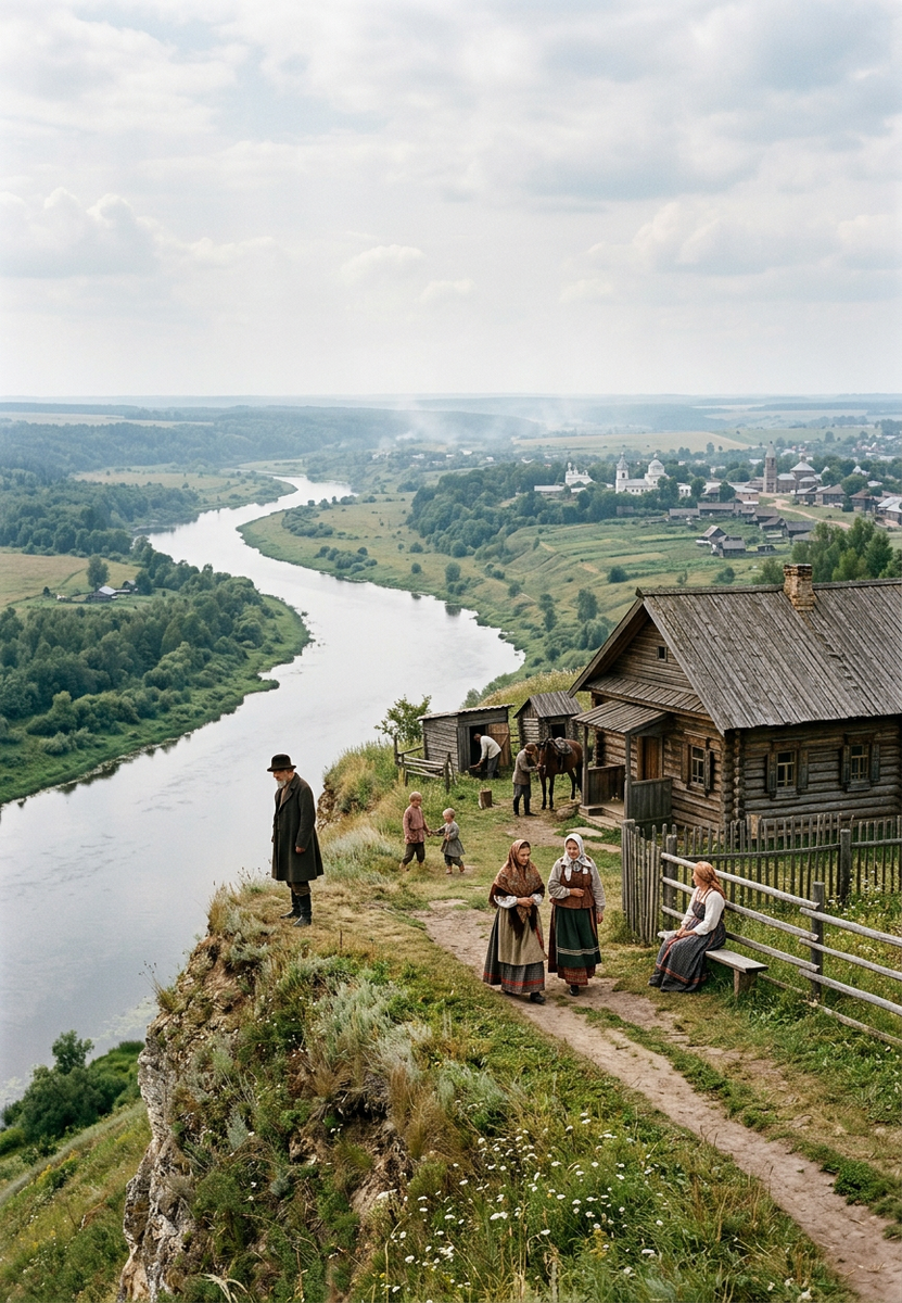 В Трубчевске XIX века город ощущается не через улицы, а через высоту, на которой он стоит, и пространство, которое открывается вокруг. Здесь не возникает ощущения замкнутости, наоборот — всё будто направлено наружу, в сторону далёких линий горизонта и мягкого течения Десны. Город не раскрывается сразу, он сначала даёт почувствовать воздух, расстояние, глубину, и только потом становится заметен в деталях. И чем дольше находишься здесь, тем яснее становится: это место живёт не внутри себя, а в постоянном диалоге с пространством вокруг. Улицы Трубчевска не замыкаются внутри, в них всегда есть направление, которое ведёт к краю, к обрыву, к виду на реку. Они могут идти спокойно, без резких изгибов, но в них чувствуется движение наружу, как будто город не удерживает, а отпускает. Грунтовые дороги утоптаны, но не перегружены, движение здесь есть, но оно не становится плотным. Идёшь по такой улице — и постепенно понимаешь, что она ведёт не к месту, а к ощущению. Застройка Трубчевска не давит