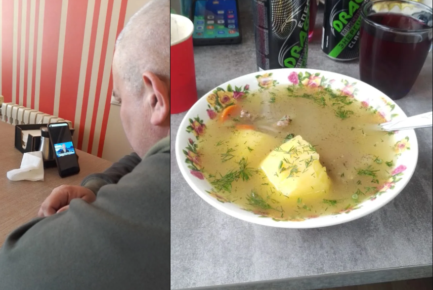 Это я жду заказ, а шурпу принесли Сереге Механику, который вот уж как полгода на фронте. Серега сам не свой до этого супа. Сейчас, наверное, очень скучает.