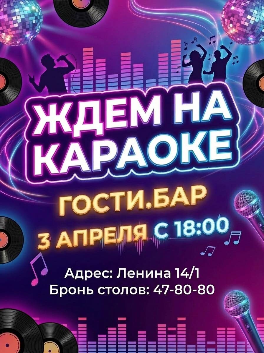 Приглашаем на караоке-вечеринку с популярными хитами, профессиональным звуком, уютной атмосферой, вкусными напитками и закусками. Возможность проявить вокальные таланты в компании друзей или коллег. Именинникам скидка на весь чек. Начало: 03 апреля 2026 18:00 Стоимость: Бесплатно Адрес: г Омск, Ленина, 14/1 Организатор: https://vk.com/public131749131 Приглашаем вас на незабываемую караоке-вечеринку, которая состоится 3 апреля в нашем уютном баре ГОСТИ.БАР! Что вас ждет: Самые популярные хиты всех времен и народов Профессиональное звуковое оборудование Уютная атмосфера и отличная компания Вкусные напитки и закуски Возможность проявить свои вокальные таланты Время проведения: с 18:00 и до самого утра! Адрес: ул. Ленина 14/1... #развлечения_современная_музыка #пение_эстрадный_вокал Узнать подробности, адрес или записаться на событие.