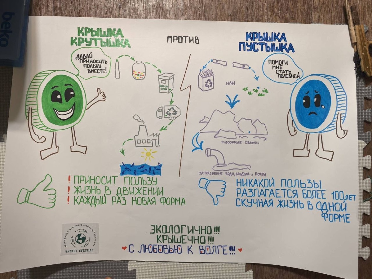 » Творческая работа №5 Авторы: Маус Наталья (мама) и Пасько Фёдор, 6 лет (сын) Краткое описание: мини-агит-комикс "Крышка крутышка против крышки пустышки". Главный смысл-агитировать к сбору пластиковых крышек как отдельного вида отходов для переработки и огромной пользы для нашей любимой Волги. И лайк крышке крутышке, так как она постоянно в движении, каждый раз приобретает новую форму и приносит пользу! Экологично Крышечно С любовью к Волге! ❤️ 📢 Голосование за лучшую работу открыто до 5 апреля включительно в официальной группе ВКонтакте: vk.com/chistoebud Голос можно будет оставить под отдельной публикацией с голосованием. #ПутешествиеКрышечкиЗаЧистоеБудущее #ВодорослямКрышка