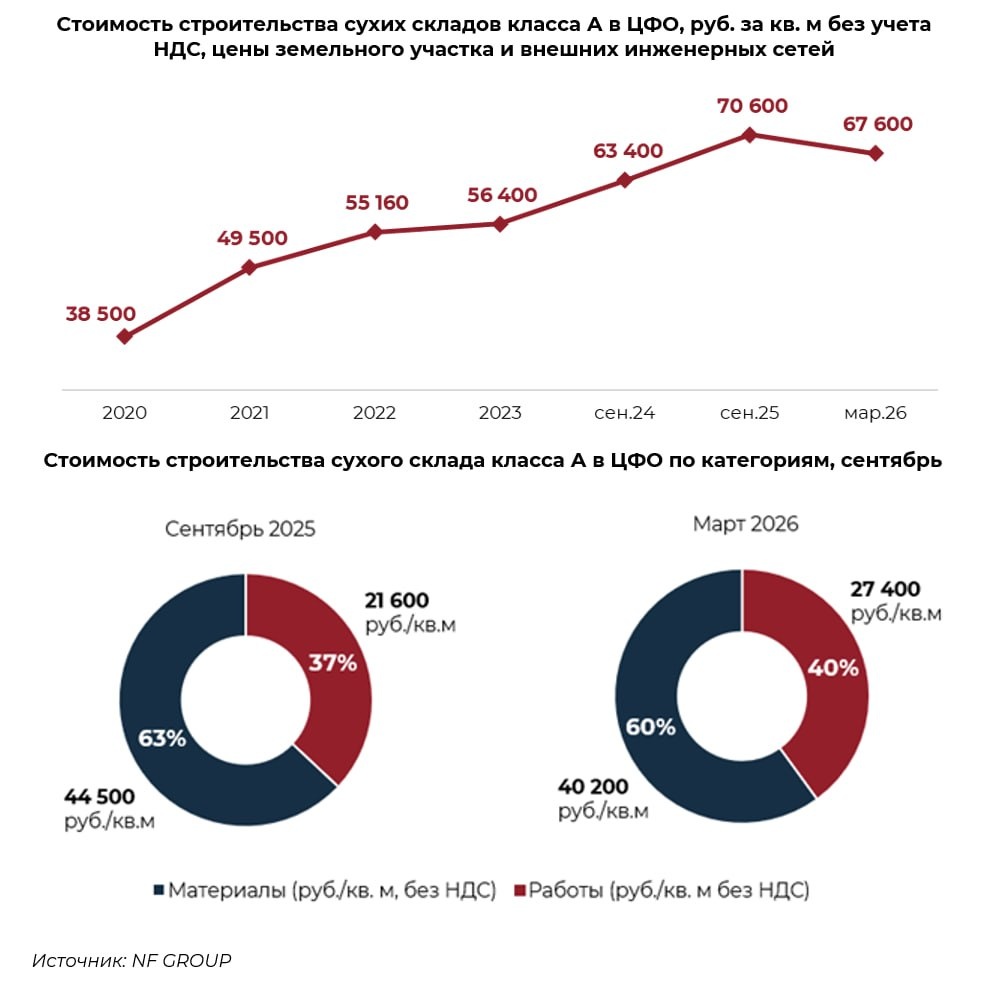 Исследование опубликовано 31 марта 2026 года - на основе опроса генподрядчиков, работающих с индустриальными объектами в регионе. 📦 Сухой склад класса А подешевел в строительстве на 4% - до ₽67 600 за м2 (без НДС, без земли, без внешних сетей). Light industrial скорректировался на 3%, до ₽74 000 за м2. Температурные объекты тоже в минусе: холодильники - ₽94 000, мультитемпература - ₽98 000, морозилки - ₽113 000 за м2. Все цифры - сентябрь 2025 vs март 2026. 🔩 Любопытен сдвиг внутри структуры затрат. В сухом складе класса А доля работ выросла с 37% до 40%, стоимость работ даже прибавила 5% - до ₽27 400 за м2. Зато материалы просели на 10%, до ₽40 200 за м2. То есть дешевеет не труд - дешевеют стройматериалы. Это важный нюанс для понимания природы коррекции. ⚠️ Сами аналитики NF Group оговариваются: снижение, вероятно, носит временный характер - по мере восстановления активности на рынке тренд может развернуться. Коррекция читается как пауза, а не разворот.