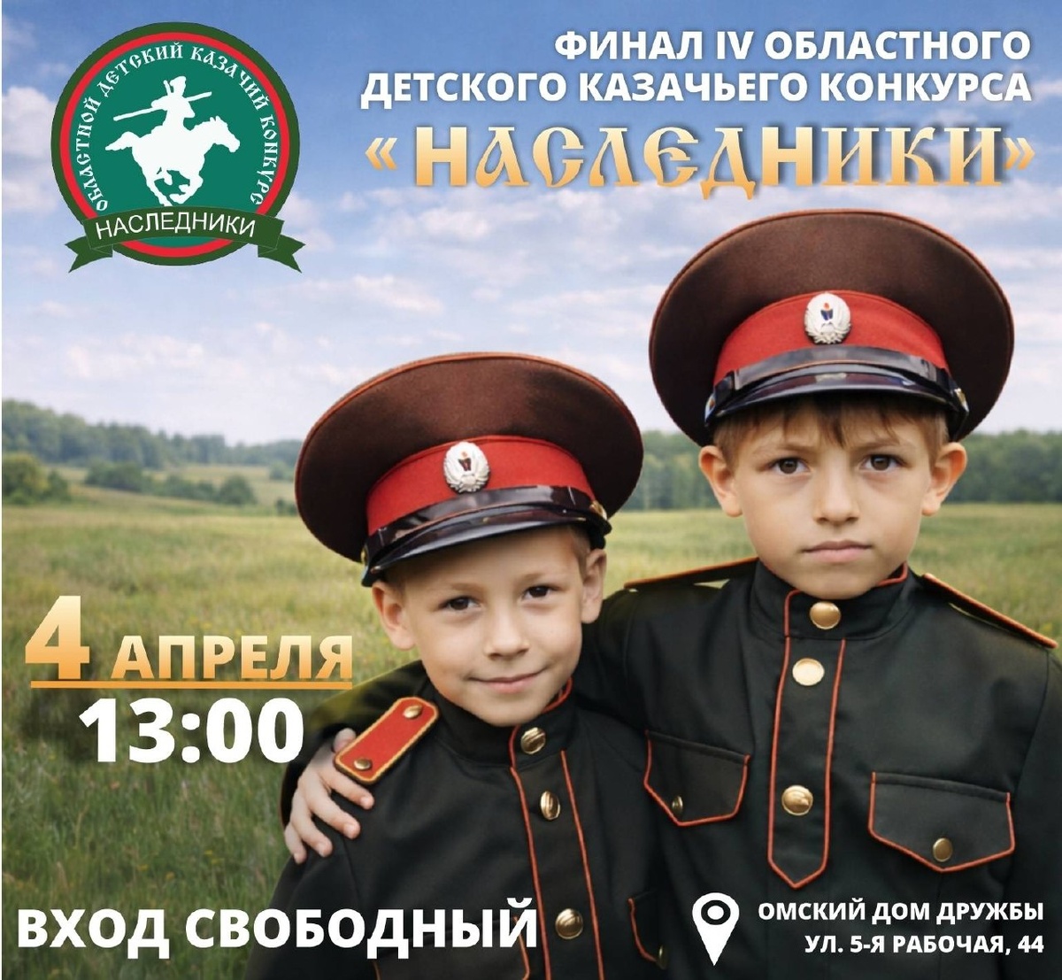 » Приглашаем на финал IV областного детского казачьего конкурса «Наследники». Участники детских и юношеских коллективов представят традиции казачества. Организаторы — Омский Дом Дружбы и региональное отделение Ассамблеи народов России при поддержке Мин Начало: 04 апреля 2026 13:00 Стоимость: Бесплатно Адрес: г Омск, 5-я Рабочая, 44 Организатор: https://vk.com/public197884604 Доброе утро, культурная столица! Приглашаем всех на финал IV областного детского казачьего конкурса «Наследники»! ⚜ 4 апреля на сцене Омского Дома Дружбы выступят участники 31 детского и юношеского самодеятельного коллектива и 11 солистов учреждений культуры, образования, центров казачьей культуры Омской области и города Омска в возрасте от 7 до 17 лет. Это уникальная возможность увидеть, как... #общество_народы_россии Узнать подробности, адрес или записаться на событие.