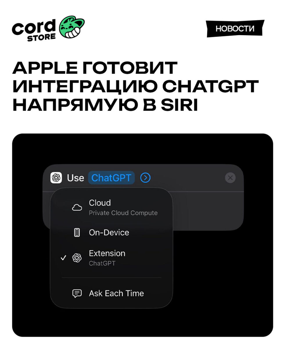 Пользователи смогут общаться с нейросетью прямо через голосового ассистента, а сама Siri начнет работать как полноценный чат-бот. Также появится функция "Расширения", позволяющая подключать сторонние ИИ-сервисы. Для этого Apple разрабатывает отдельное приложение, которое будет отвечать за работу ChatGPT внутри Siri и взаимодействие с другими ИИ. Такая интеграция может стать альтернативным способом доступа к сервису. #Apple #OpenAI #ИИ 🏆 Cord Store Media