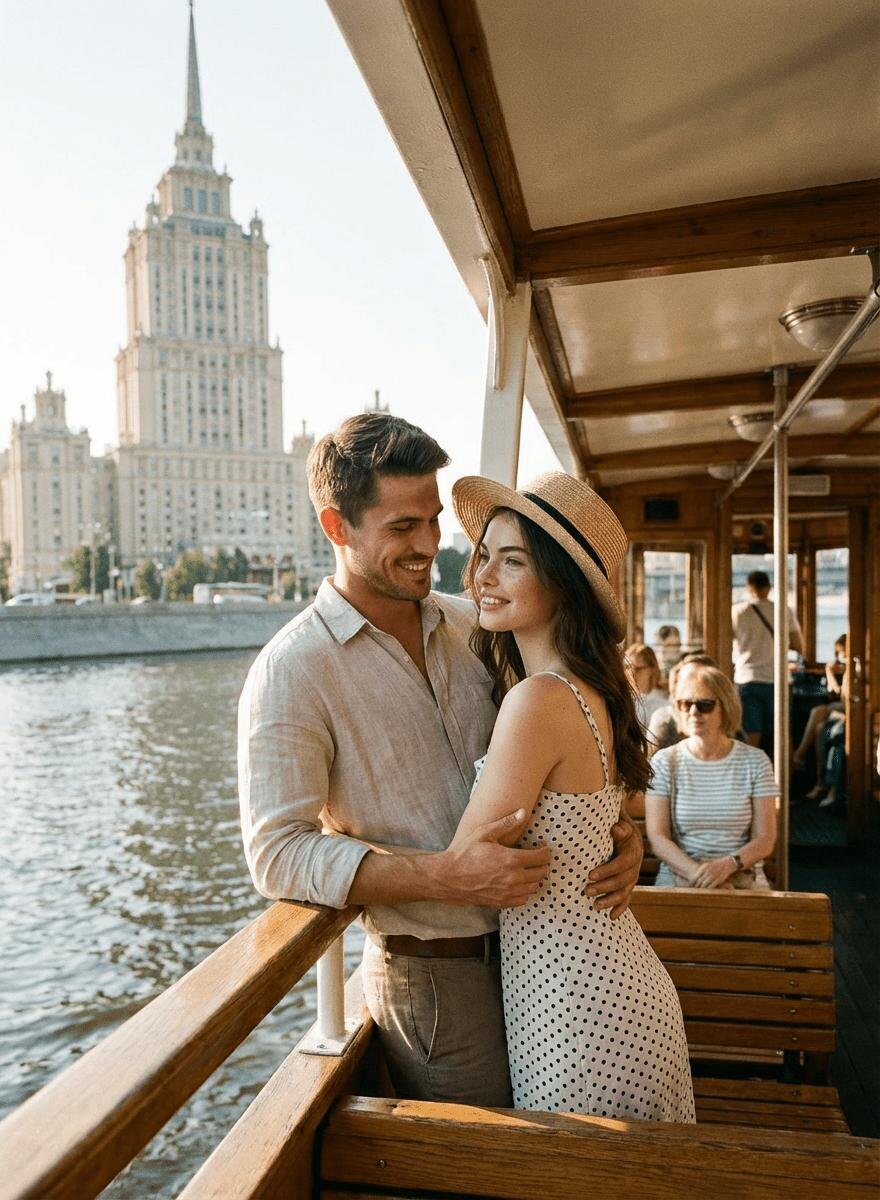 Сгенерировать фото⚡️ Перейти в бота 🤖 Используй лица мужчины и женщины с загруженных фото. Молодая пара в стильной летней одежде катается на речном трамвайчике по Москве-реке. Они обнимаются у борта, смотрят на проплывающие сталинские высотки. Беззаботная атмосфера, модный ретро-лук.