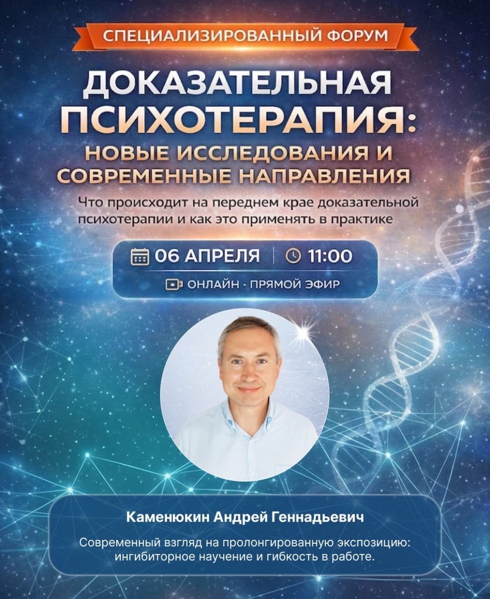 👨⚕️ Андрей Геннадьевич Каменюкин врач-психотерапевт,основатель Клиники когнитивной психотерапии CBT Clinic Тема доклада: 🧠 Современный взгляд на пролонгированную экспозицию: ингибиторное научение и гибкость в работе Пролонгированная экспозиция остаётся одним из ключевых методов терапии ПТСР За последнее время существенно изменилось понимание механизмов её действия и принципов применения в практике В докладе будет рассмотрено: — как модель ингибиторного научения меняет понимание экспозиции — почему важна гибкость в построении экспозиционной работы — какие клинические решения сегодня считаются более эффективными по сравнению с классической логикой «привыкания» — как это влияет на работу с травматической памятью в реальной практике 📝 Это выступление — про обновление профессиональной оптики специалиста в работе с экспозицией, а не про базовое знакомство с методом 📅 6 апреля 🕚 начало в 11:00 💻 формат: онлайн Регистрация — https://cbtclinic.education/evidence-based-psychotherapy