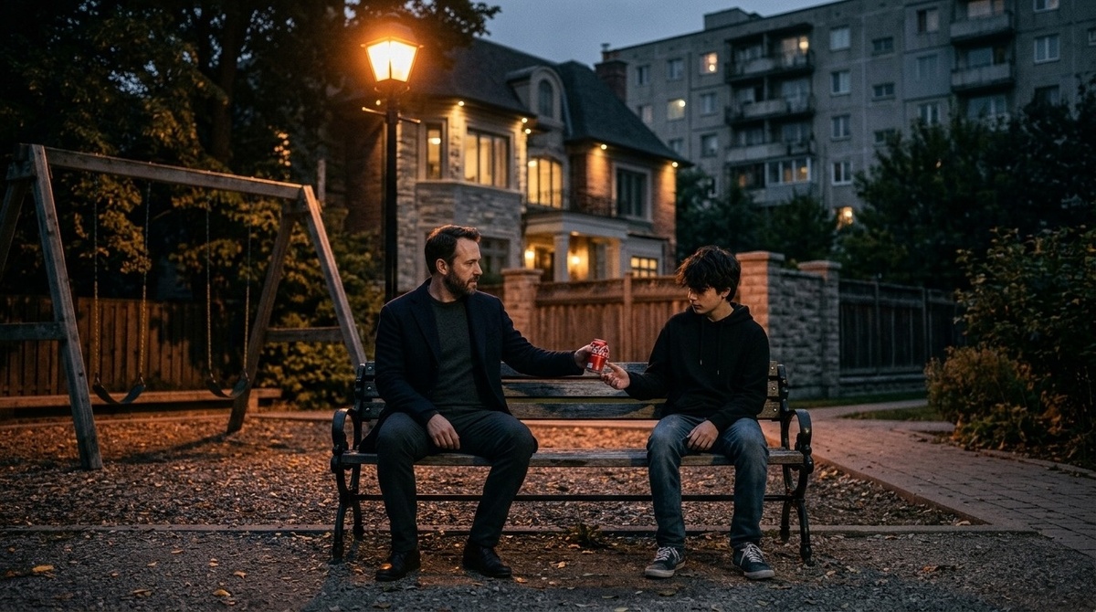 Поздно вечером Алексей выглянул в окно. Во дворе, на пустой детской площадке, под одиноким фонарём, на лавочке сидел Илья. Сгорбленный, в своей чёрной худи, он смотрел куда-то в темноту.