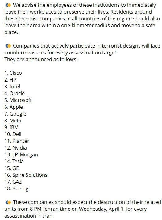 'For every assassination, one American company will be destroyed' 'Expect destruction of their relevant units starting Wednesday, April 1, in response to each assassination in Iran'