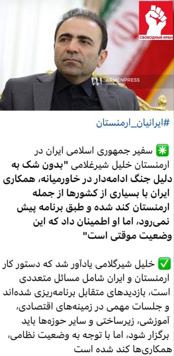 ⚡️ Халил Ширгулами сказал, что сотрудничество Тегерана и Армении притормозилось из-за войны на Ближнем Востоке, но это, по его словам, временно. На повестке у сторон — визиты, экономика, образование и инфраструктура. Подпишитесь на канал