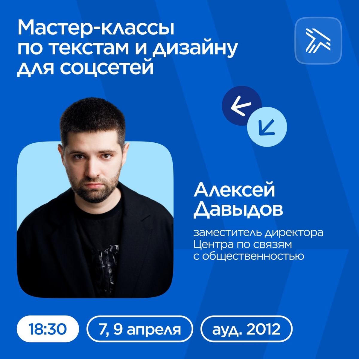 Спикер: Алексей Давыдов, заместитель директора Центра по связям с общественностью РУТ. 🔵7 апреля — Тексты для социальных сетей Как писать посты, которые дочитают хотя бы до середины. Разбираем основные ошибки в текстах для соцсетей, приёмы для удержания внимания и структуру вовлекающего поста. 🔵9 апреля — Figma для социальных сетей Основные инструменты и функции Figma для новичков, автоматизация рутинных задач и лайфхаки, которые экономят время на графике. Вёрстка стильных и аккуратных постов — практика на ноутбуках, которые нужно взять с собой ;) ⏰ Начало — в 18:30 в аудитории 2012. Регистрация по ссылке. Будь в курсе событий РУТ