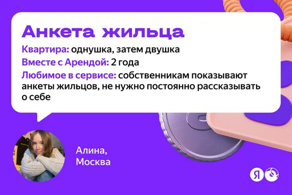 Алине дважды пришлось переезжать, и оба раза – из-за работы, ей хотелось жить поближе к офису. Казалось бы, найти квартиру в огромной Москве – не проблема, но на деле это оказалось задачкой со звёздочкой… Особенно, когда с тобой живут котики. Мы узнали о Яндекс Аренде два года назад. На тот момент мы устали от грубых риелторов и бесконечных переговоров с собственниками. У нас есть несколько домашних животных, и это, к сожалению, становилось преградой при попытках найти жильё в аренду. Чего мы тогда только не наслушались о нас и наших котиках… Нам понравилось, что в Яндекс Аренде было легко отфильтровать объявления под наш запрос – в приложении и на сайте есть специальная галочка «можно с животными». Дополнительно в анкете для жильцов можно указать наличие питомца и даже прикрепить его фото. Ещё очень удобными для нас оказались 3D-туры в объявлениях. У нас не было ни времени, ни желания ездить по квартирам – онлайн просмотр нас полностью устраивал. Весь поиск занял около 2 недель: снача