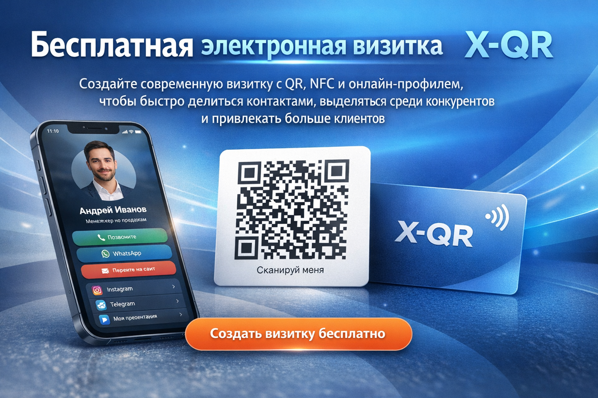 X-QR объединяет в одном решении электронную визитку, QR-визитку, NFC-визитку и онлайн-визитку. Это удобно для личного бренда, полезно для бизнеса и особенно эффективно там, где важно производить сильное первое впечатление и не терять клиентов после первого контакта. По описанию сервиса, начать можно бесплатно, а затем при необходимости расширять функциональность и подключать дополнительные форматы.