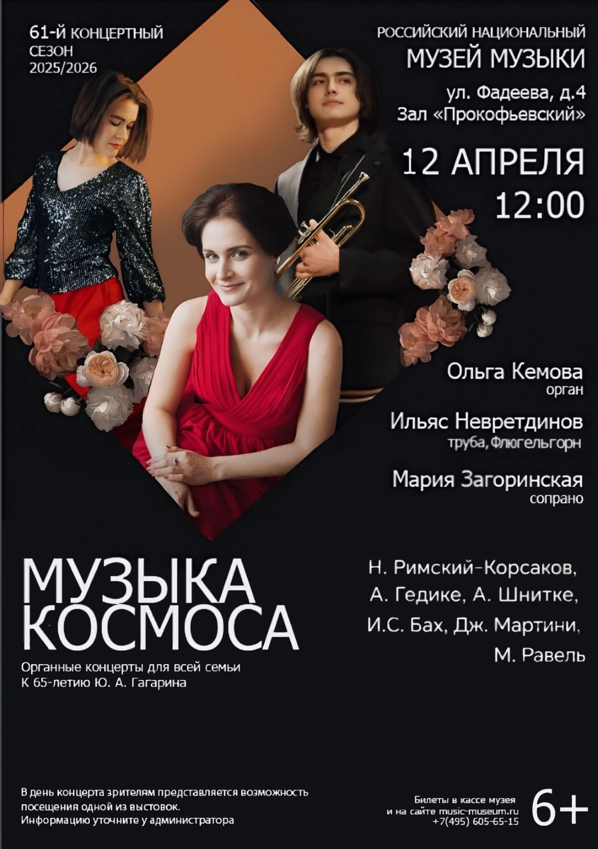 12 апреля в 12:00 в «Прокофьевском» зале Российского национального Музея музыки состоится концерт «К 65-летию полëта Ю.А. Гагарина. Музыка и космос»