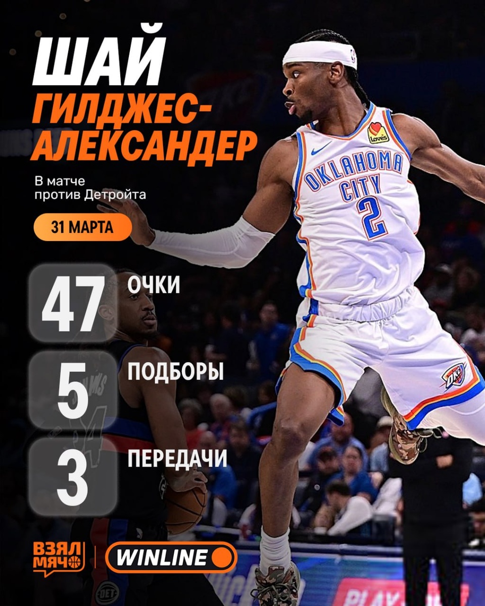 Сегодня ночью главные фавориты гонки — Гилджес-Александер и Вембаньяма — выдали огненные матчи: 🔸 лидер «Оклахомы» вытащил игру в овертайме против «Детройта» (114:110), набрав 47 очков (12/19 с игры, 2/3 из-за дуги и 21/25 с линии); 🔸 француз против «Чикаго» (129:114) набрал 41 очко (17/27 с игры, 3/6 из-за дуги, 4/4 с линии), собрал 16 подборов, сделал 3 блока и отметился самым быстрым дабл-даблом в истории лиги (8 минут и 31 секунда). Нас ждёт интересная концовка регулярки 😉 🏀 ПОДПИШИСЬ — ЗДЕСЬ ЖИВЁТ БАСКЕТБОЛ!