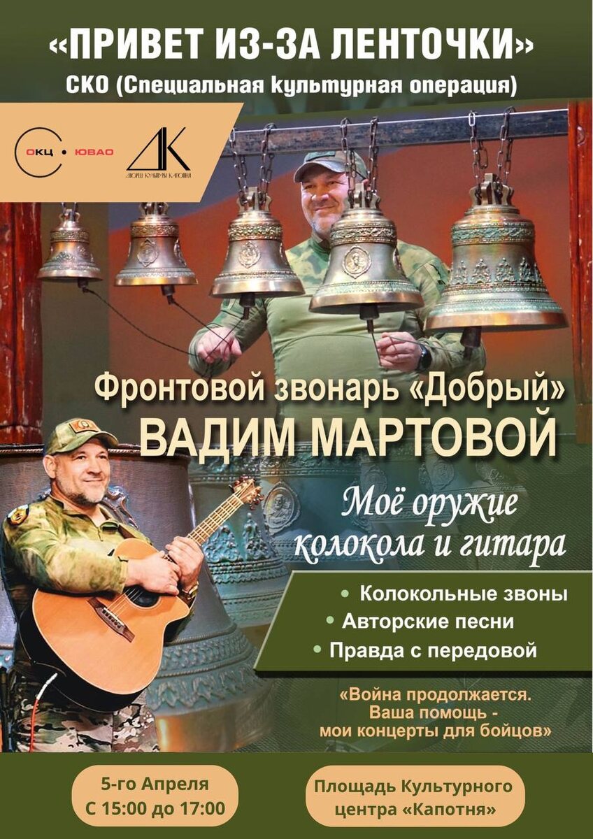 ! Единственный в России фронтовой звонарь с позывным «Добрый» (Вадим Мартовой) устроит мощное шоу на площади перед ДК «Капотня»! Что будет: 🔥 фронтовые хиты и авторские треки; 🔥 уникальные звоны на единственной в стране фронтовой колокольне; 🔥 возможность самому позвонить в колокола! 🗓 5 апреля, 15:00–17:00 📍 Площадь перед ДК «Капотня» Не пропусти событие, которое точно запомнится! Делись с друзьями ✈️ #КультураМосквы #КультураЮВАО #ОКЦЮВАО