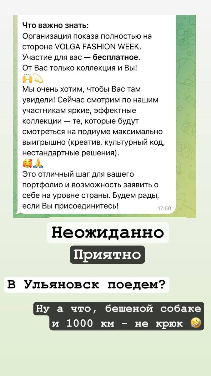 И сейчас тоже я в раздумьях. Думаю про губернский стиль. Хочу выйти с коллекцией от своей студии, но пока не могу сформулировать предложение у себя в голове. Хочу набрать 3-5 человек для совместной работы, образы будете делать вместе со мной, представите на показе и оставите его у себя. Опыт не нужен. Получите диплом участника в показах федерального или международного уровня, возможно решите продолжить развиваться в этом направлении. Пока думаю, надо мне это или нет. Скажите, есть тут те, кому это было бы интересно? Участие платное, естественно.