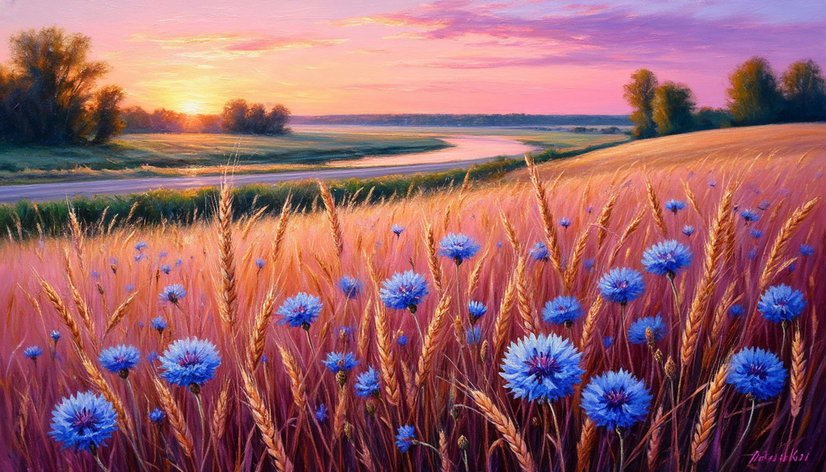 «Вечерний пейзаж в стиле Евафарк: на переднем плане — крупная композиция из золотистой ржи с яркими васильками. Вдали — извилистая дорога и спокойная река. Техника масляной живописи, нежные пастельные тона с розово‑лиловой аурой вокруг объектов. Золотая теплота вечернего света, мягкие длинные тени. Эффект 5D‑формата: объём, глубина, реалистичная текстура колосьев и лепестков. Высокая детализация, плавные переходы цвета, атмосфера нежности и умиротворения» Вариант 2 (лаконичный, фокус на стиле и цветовой гамме, 386 символов):
