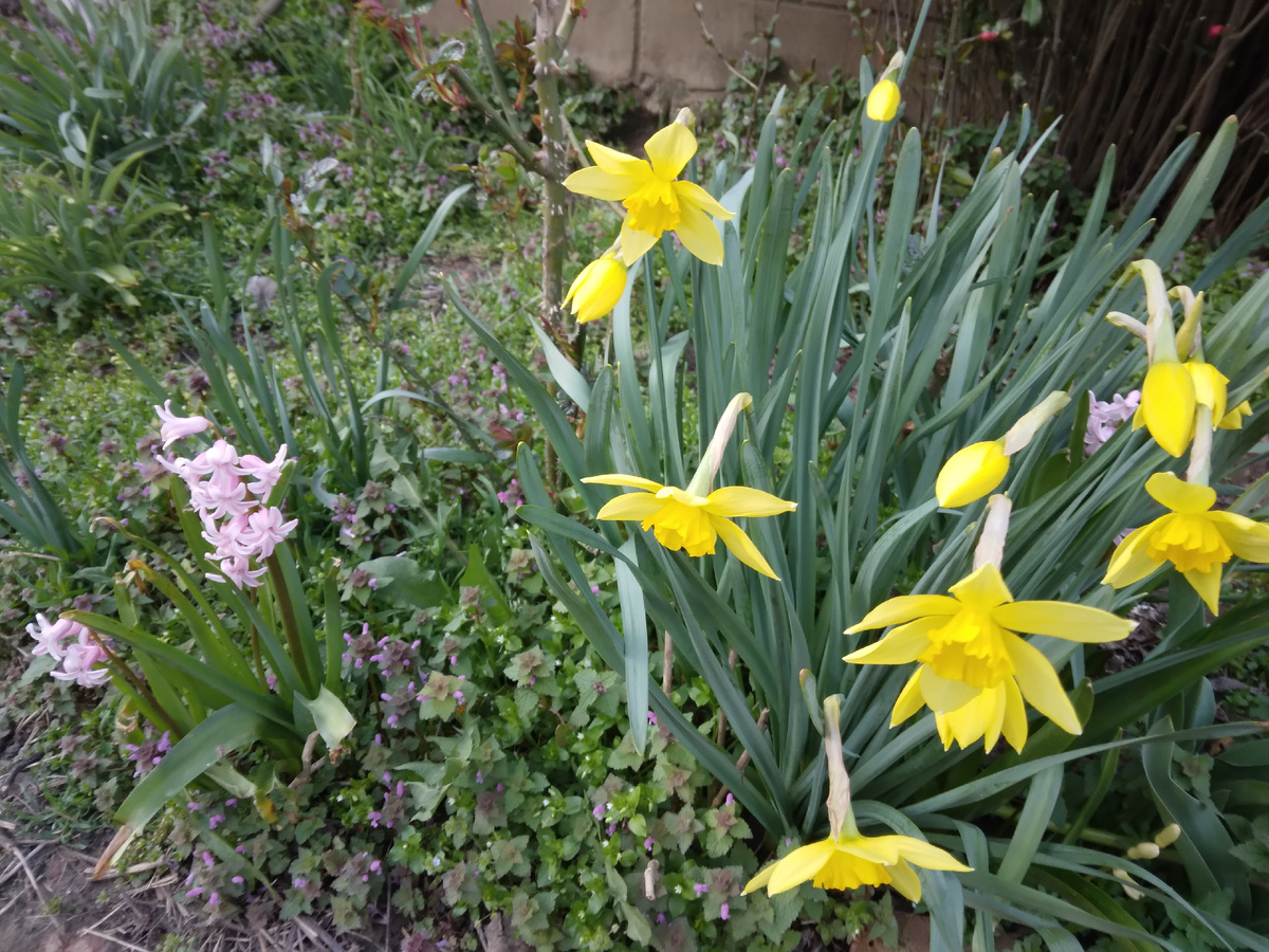 Быстро идёт в рост трава, уже надо начинать выкашивать участок. Лезет мокрица, заплетая клумбы. Зацвели дикие гиацинты- голубые и розовые.