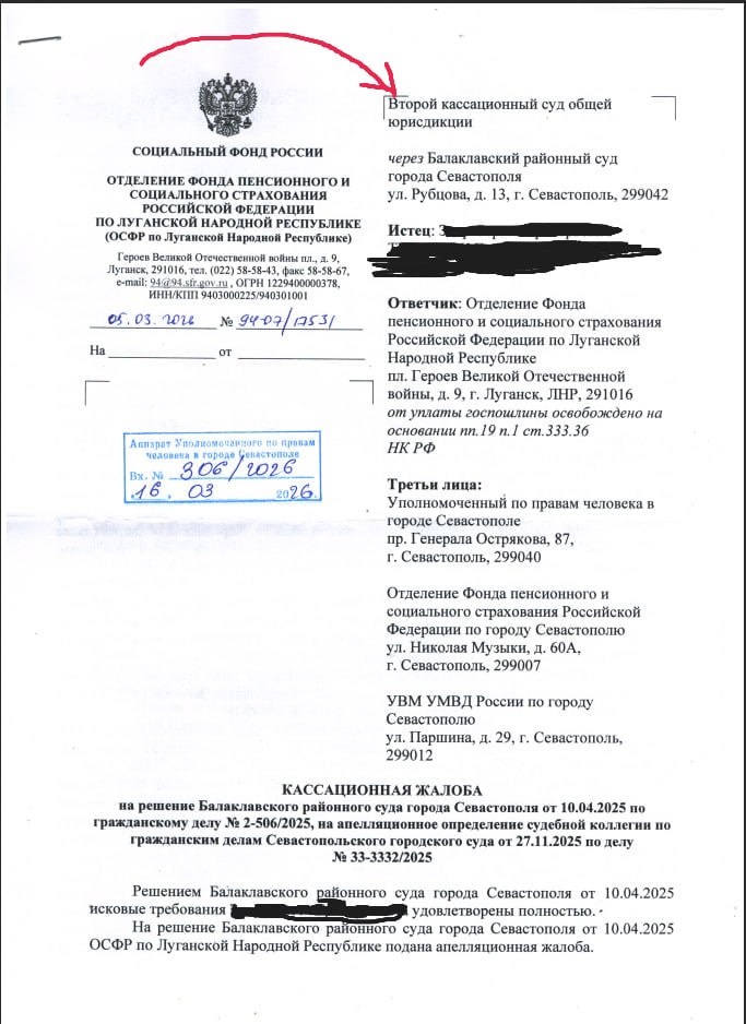 🇷🇺 🤓Мы уже прошли 2 судебные инстанции - Балаклавский районный суд и апелляцию - Севастопольский городской суд. 🤦♂️Но недавно в мои цепкие лапы попала кассация от СФР Луганска. Про качество работы коллег-юристов в нашей профессии не принято говорить, однако прошу обратить внимание на то, что кассационную жалобу наши оппоненты хотят заслать во Второй кассационный суд - Москву, а правильная подсудность - Четвертый кассационный суд - Краснодар. 😆 Собственно, дальше жалобу можно не читать и так понятно, насколько глубоко пенсионщики понимают право, если даже не знают, в какой суд им надо обращаться. 💸 Дальше больше, мы подали еще одно заявление в Балаклавский суд, где попросили установить судебную неустойку, так называемый астрент, в отношении СФР Луганска в размере 50 тысяч рублей в месяц. 🪙А теперь следите за руками: как только заявление удовлетворяют, мы взыскиваем деньги уже не из средств фонда, а из бюджета Луганской Народной Республики. Эти деньги не являются пенсией мое
