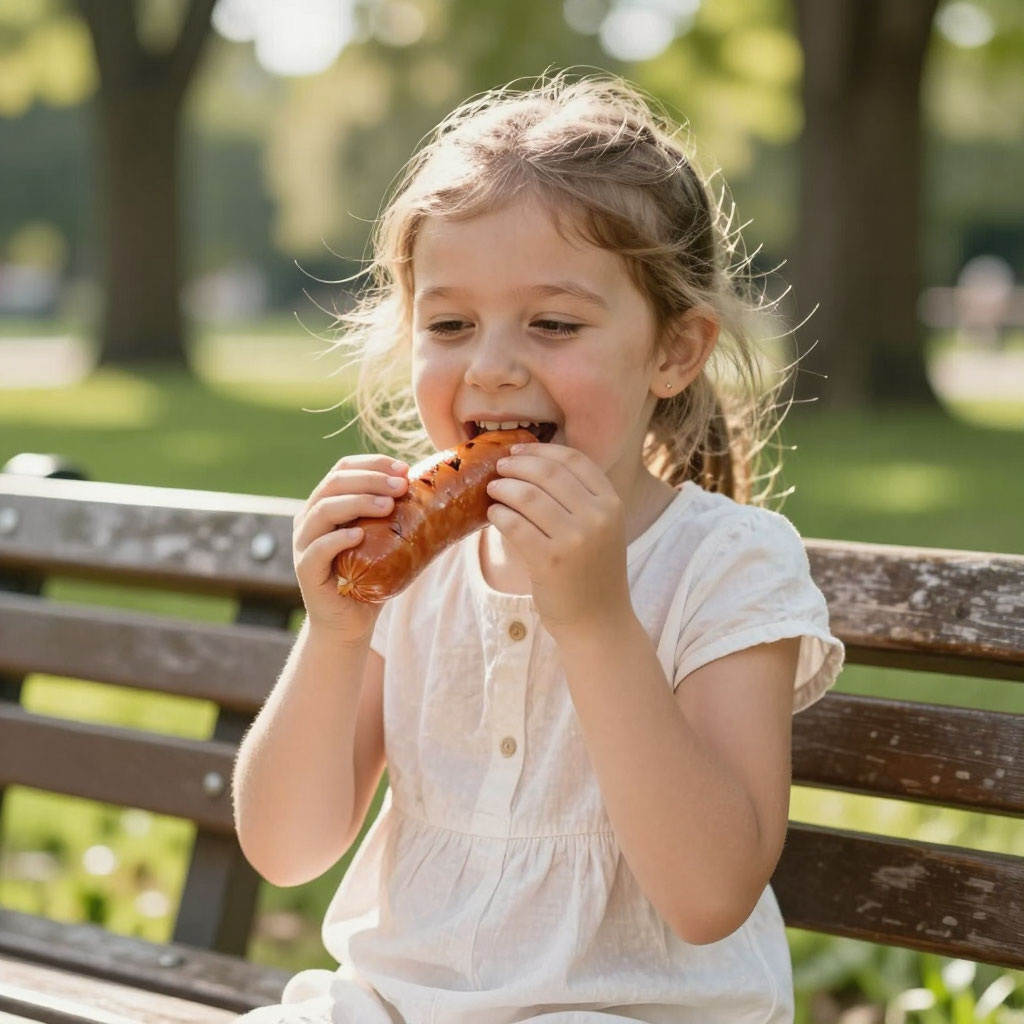 Вскоре она устала есть, но толстая аппетитная сарделька манила своим вкусом и совсем не хотела заканчиваться, не смотря на все усилия маленькой девочки.