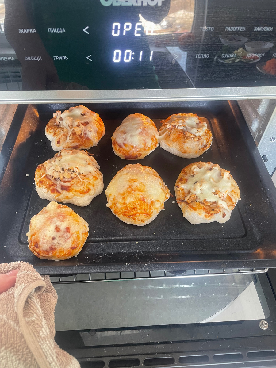 Испекла мини-пиццы, тесто дрожжевое, делала накануне в хлебопечке. Часть с курицей, сыну просто сырные, его любимая пицца.