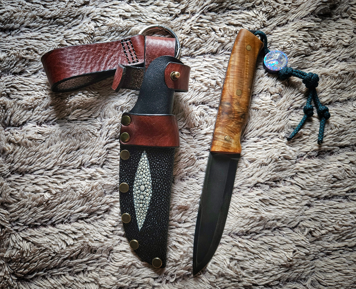 Изначально, это был невероятно криво сделанный нож, но с харизмой, душой, идеей. На клинке 9хс, уголь. Затермичена так, что отдыхают многие порошковые стали. Не выкрашивается, не мнется, не ломается. Прям совсем. На рукояти стояла какая-то деревяшка, причём, на