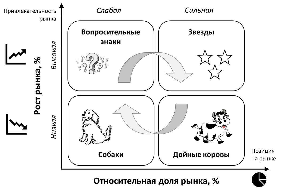 4. «Собаки» - исключить или минимизировать инвестиции; сокращать или ликвидировать; поддерживать минимальную жизнеспособность, если данная бизнес-единица или продуктовая категория еще приносят прибыль, или их сохранение в портфеле целесообразно по каким-то другим причинам.