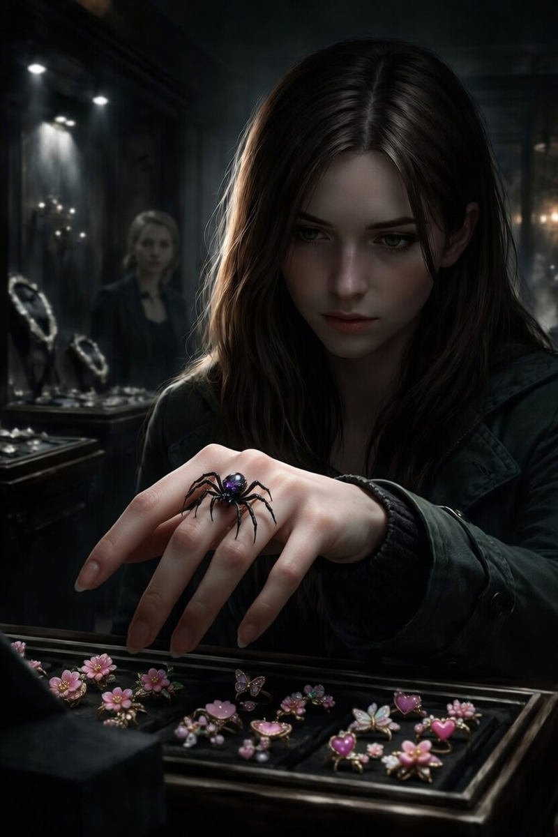 Кольцо-паук. Белое золото, холодное и тяжёлое даже на вид. На нём сидел изящный хищник - тонкие лапки из металла, такие филигранные, что казались живыми. Брюшко - глубокий, почти чёрный аметист, огранённый так, что внутри него переливалась холодная фиолетовая тьма, словно кто-то взял кусочек ночного неба и поместил его в камень. Когда свет падал под углом, паучок вроде подмигивал - злобно и голодно.