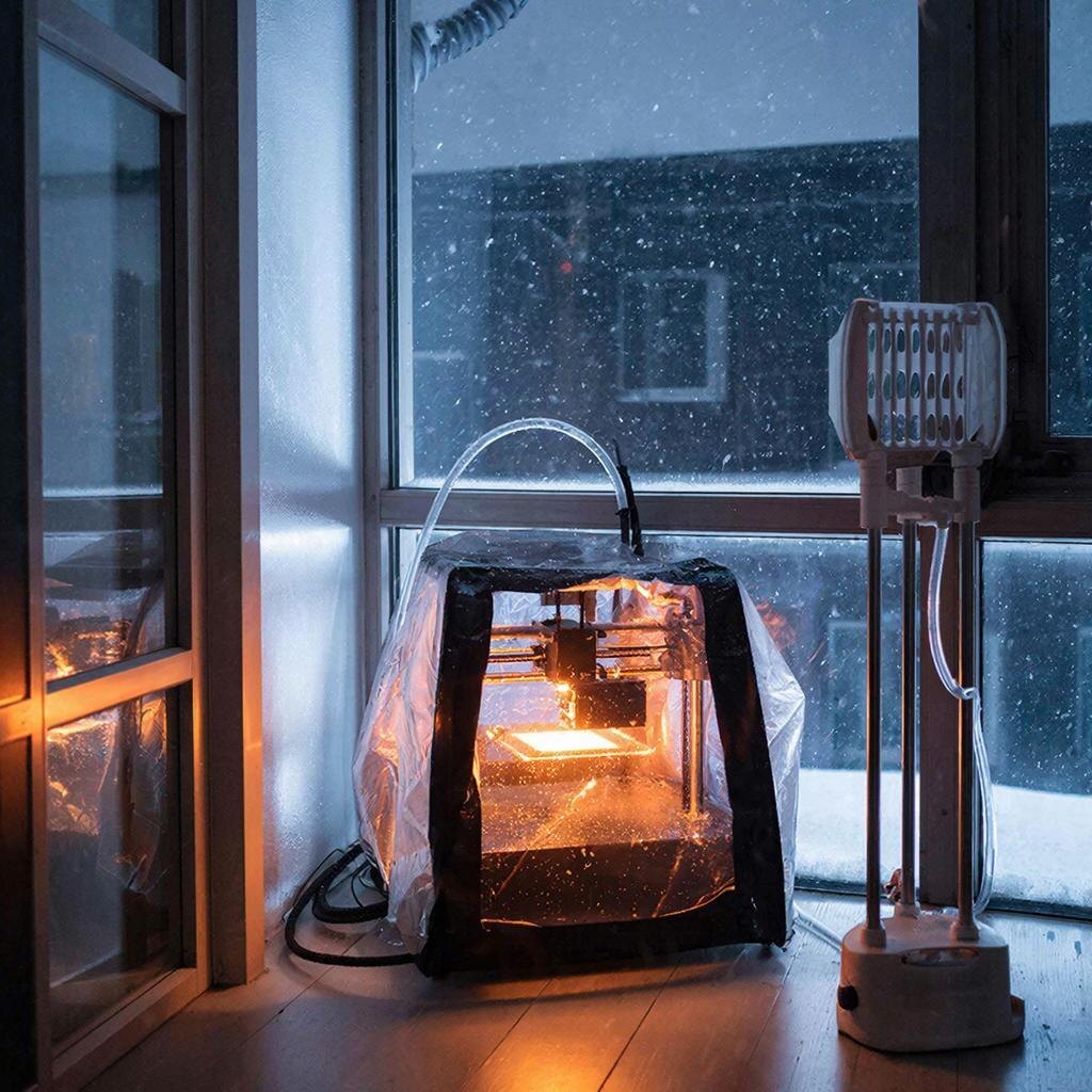 Самый простой и рабочий вариант — купить или сшить так называемый фотобокс (тент для 3D-принтера). Это палатка из плотной огнестойкой ткани с внутренним слоем из отражающей фольги. Принтер ставится внутрь, молния закрывается. Стол нагревается до 110 градусов и за полчаса прогревает объем палатки до комфортных для нейлона 40 градусов.