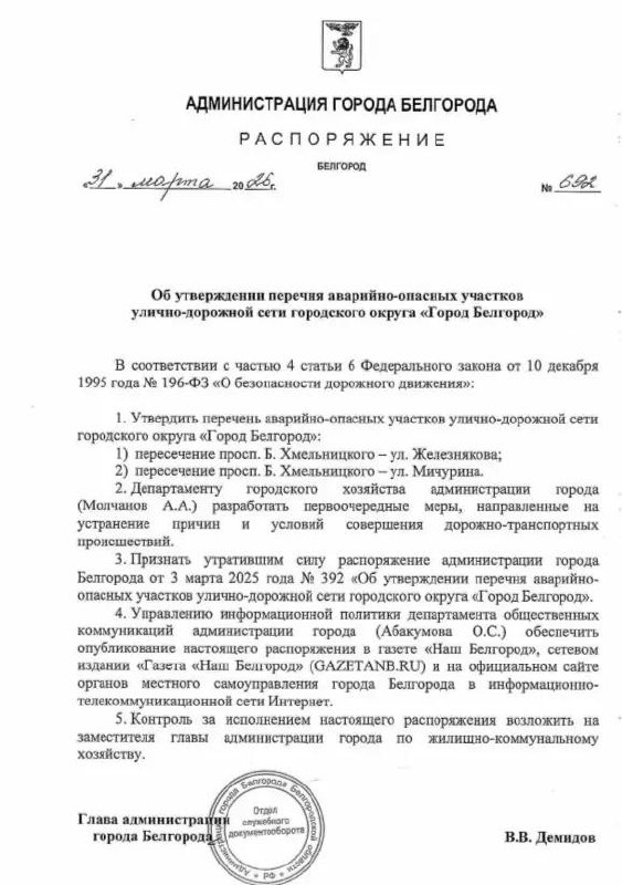Согласно подписанному мэром Валентином Демидовым распоряжению, аварийными признаны: — перекрёсток проспекта Богдана Хмельницкого и улицы Железнякова; — перекрёсток проспекта Богдана Хмельницкого и улицы Мичурина. Администрация поручила Департаменту городского хозяйства подготовить меры для предотвращения ДТП. Подписаться на 🗞🗞 | Мы в МАХ
