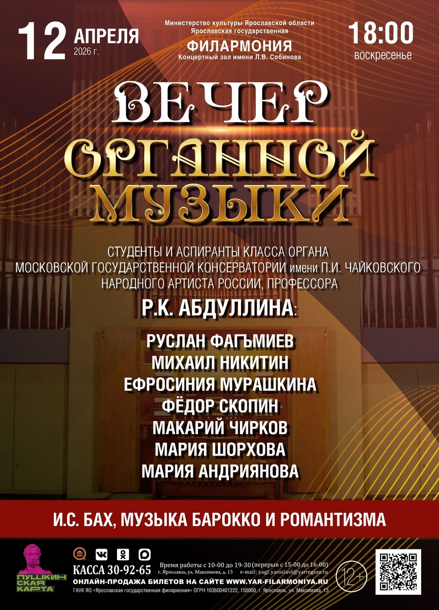 🎶Виртуозные этюды и героические образы Франка и Босси - музыка, устремленная ввысь, к новым горизонтам и открытиям. 📍12 апреля 2026 г.в 18:00 ждем вас на Вечер органной музыки, где звуки встречаются с бесконечностью.🚀 👏 Выступают студенты класса органа Московской государственной консерватории имени П.И. Чайковского народного артиста России, профессора Рубина Абдуллина: Руслан Фагъмиев, Михаил Никитин, Евфросиния Мурашкина, Фёдор Скопин, Макарий Чирков, Мария Шорохова, Мария Андриянова Софья Иглицкая