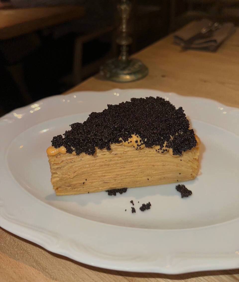 Десерт из специального меню так понравился гостям, что появился и в основном. Блинный торт со сгущенкой и маком из Moro, одобряем.
