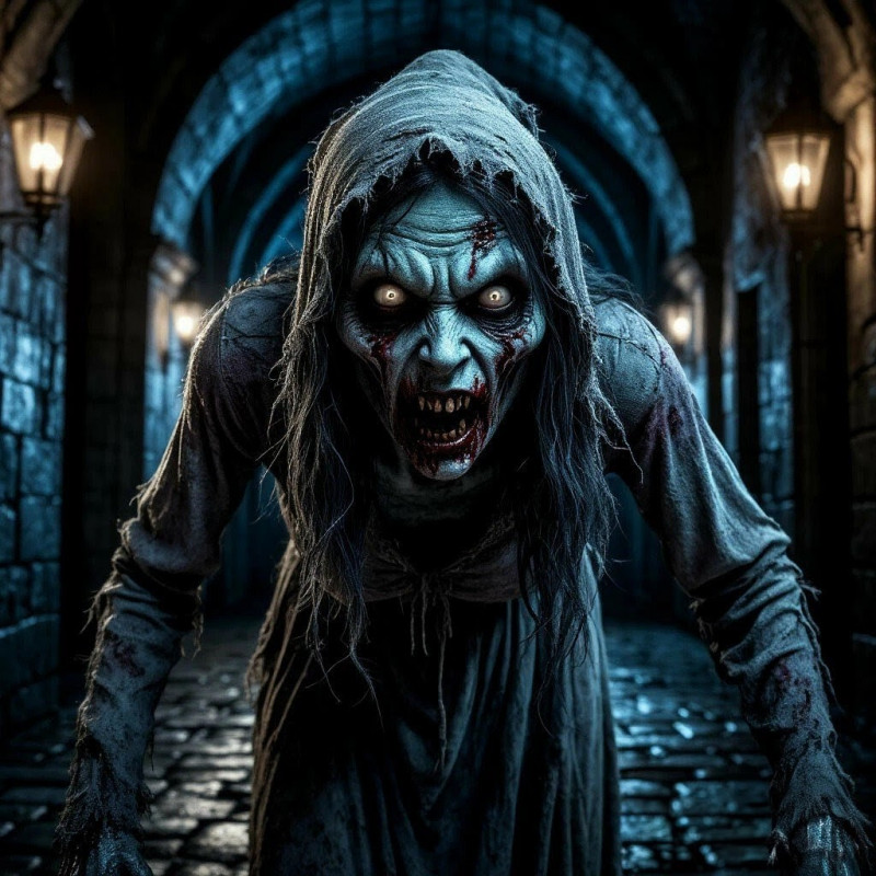 - Послушай, мирянка, ты из города? Как и зачем ты сюда проникла? – Обратился Дер Форгос к женщине, одновременно делая шаг вперед. При этом он поднял факел, чтобы лучше рассмотреть неизвестную гостью. И в этот момент она подняла голову, уставившись на Мельхара, и князь подавился своим воплем, издав только полузадушенное сипение. Его ноги будто примерзли к прогнившим доскам пола, генерал не мог сдвинуться с места. Лицо женщины представляло собой лицо трупа, одутловатое и мучнисто-бледное, ушедшие под лоб глаза смотрели на Дер Форгоса мутными белками, из синюшных губ торчали обрывки ниток, которыми раньше был зашит рот покойницы. Этот распухший от разложения рот открылся, из него донёсся низкий горловой звук собирающегося напасть хищника. Так вот, с чем столкнулась Дейзи у себя в башне, когда её отчаянные крики заставили Мельхара бежать к ней на помощь! Сейчас же он мог рассчитывать исключительно на самого себя. Мёртвая женщина протянула к Дер Форгосу покрытую следами тления руку, продолжая низко и утробно рычать.