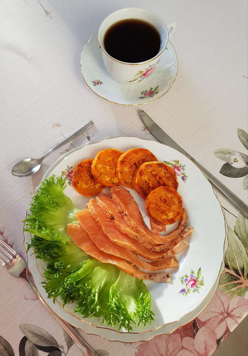 Добрый день, дорогие друзья! Предлагаю в честь Вербного воскресенья начать день с соленой семги в сочетании с бататом, приготовленным на электрогриле. Для приготовления 10 порций соленой семги нам понадобятся: свежая семга (вес чистого филе без кожи и костей 1 килограмм), 1 столовая ложка тростникового сахара, 2 столовые ложки соли, 2 столовые ложки молотого кофе, 1 лимон (30 грамм лимонного сока). Для оформления 10 порций нам понадобятся: 1 килограмм батата, 200 грамм листьев салата. Приготовление: филе очистить от костей и кожи. Поперечные кости удалить при помощи кухонного пинцета. В чашке смешать соль, сахар и кофе. Выжать сок лимона и добавить в чашку. Смазать смесью филе рыбы. Уложить рыбу в пакет, удалить воздух и запаять пакет. Убрать рыбу в холодильник на 24 часа. Через 24 часа рыбка готова. Нарезать её ломтиками. На тарелку выложить листья салата и кусочки сёмги. Дополнить блюдо бататом. Приятного аппетита!