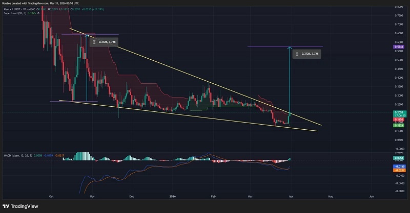 Цена токена Keeta (KTA) продемонстрировала стремительный рост почти на 40% за последние 24 часа, достигнув двухнедельного максимума на уровне $0,205 во вторник. Прорыв из фигуры «падающий клин» усиливает потенциал дальнейшего роста актива в ближайшие недели. Стоимость Keeta увеличилась на 39% и достигла отметки $0,205 во вторник, 31 марта, после чего на момент публикации стабилизировалась вблизи $0,204. Рост цены Keeta был обусловлен повышенным интересом со стороны сообщества в преддверии запланированных на сегодня заявлений команды проекта. Ожидается, что разработчики представят обновления по текущему прогрессу и расскажут о предстоящих релизах. Исторически криптовалютный рынок демонстрирует рост котировок на фоне ожиданий значимых новостей. Позитивные настроения инвесторов также поддерживаются стратегией Keeta по приобретению регулируемого банка с использованием резервов в размере около $9 млн в токенах KTA. Данная инициатива направлена на интеграцию традиционной финансовой системы