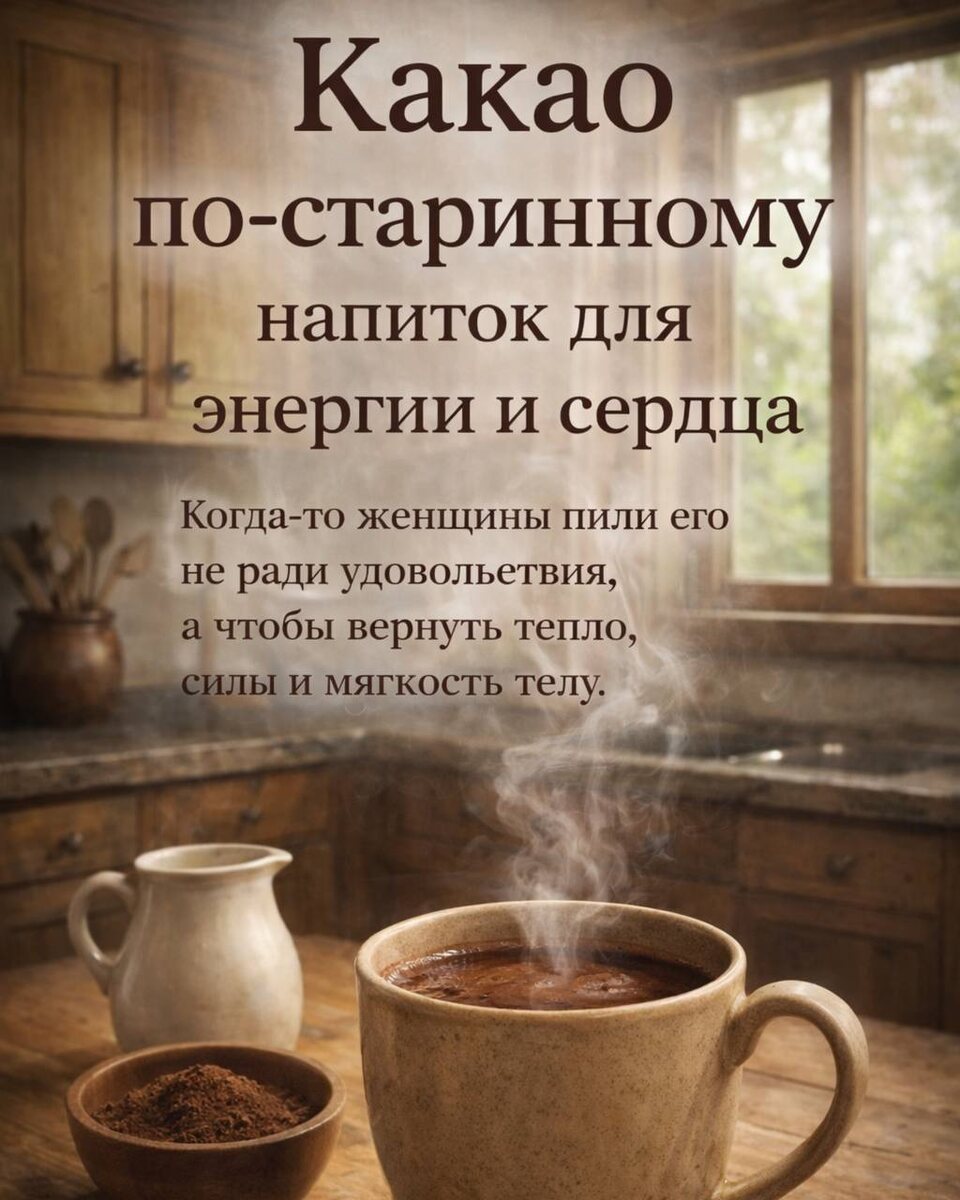 — а когда-то женщины выбирали какао, чтобы мягко почувствовать себя и наполниться изнутри. 🌰 Какао по старинным рецептам — это не просто напиток. Это тепло, которое расходится по телу, поддержка сил, забота о сердце и спокойная энергия, которая приходит без напряжения и спешки. В каждой чашке — тишина, уют и ощущение, что о тебе позаботились. Народные рецепты | Кирпикова