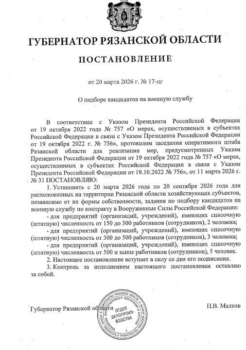 В Рязани предприятия обязали направлять сотрудников на СВО для службы по контракту — согласно постановлению губернатора Павла Малкова