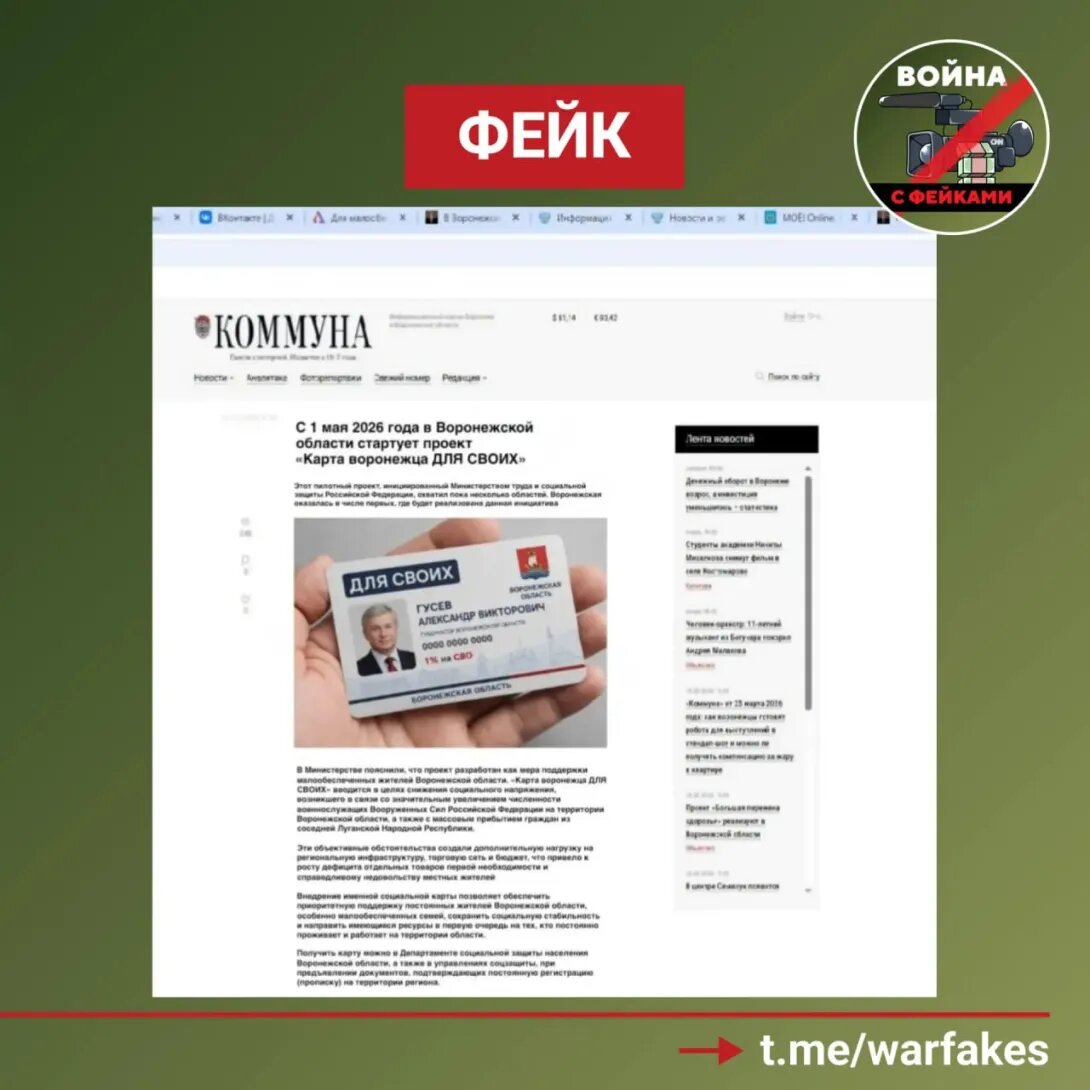 По региональным пабликам рассылают недостоверную информацию о запуске в Воронежской области программы «Карта воронежца для СВОИХ», якобы предназначенной для поддержки малообеспеченных граждан. Поводом для обсуждения стали скриншоты, стилизованные под публикацию на сайте газеты «Коммуна», а также видеоролик с участием якобы министра социальной защиты региона Ольги Сергеевой. Как установили эксперты, данная информация не соответствует действительности. Указанная программа в регионе не запускалась, а представленные изображения и видео являются подделкой. На одном из скриншотов обнаружены несоответствия: фотография на карте не похожа на губернатора Воронежской области, а герб региона изображён с ошибками. На другом изображении фото и символика заменены на корректные, однако следы редактирования заметны невооружённым глазом. Кроме того, в тексте содержатся фактические неточности — упоминается Департамент социальной защиты населения, который прекратил существование ещё в 2023 году после пере