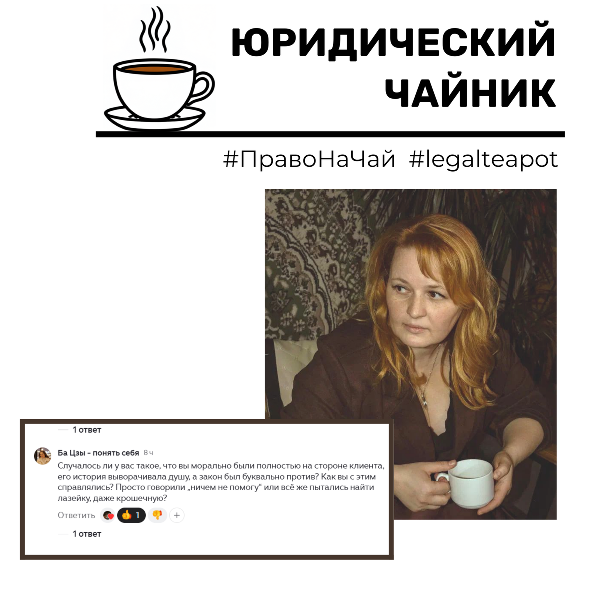 Ну что, наливайте кружки побольше... сегодня о личном. Читательница с ником «Ба Цзы — понять себя» написала вопрос-комментарий к посту. Спрашивала: случалось ли такое, что ты морально полностью на стороне клиента, его история выворачивает душу, а закон буквально против? Как справлялась? Просто говорила «ничем не помогу» или всё же пыталась найти лазейку? Отвечаю как есть. Я практически всегда болею за своих клиентов. И мне хочется помочь во что бы то ни стало. Но есть важный момент: я не предлагаю бороться любой ценой. Не предлагаю платить огромные деньги за судебные расходы, дорогостоящие экспертизы, если понимаю, что вложенные силы и средства не окупятся результатом. Я всегда взвешиваю это вместе с клиентом. Но если человек готов идти, а я вижу хотя бы крошечный шанс — я иду с ним. Потому что, если бы это было мое личное дело, я бы действовала так же. Я уже упоминала эту историю в посте «Дело, в котором важны были не только документы». Оно было одним из первых серьезных в моей частн