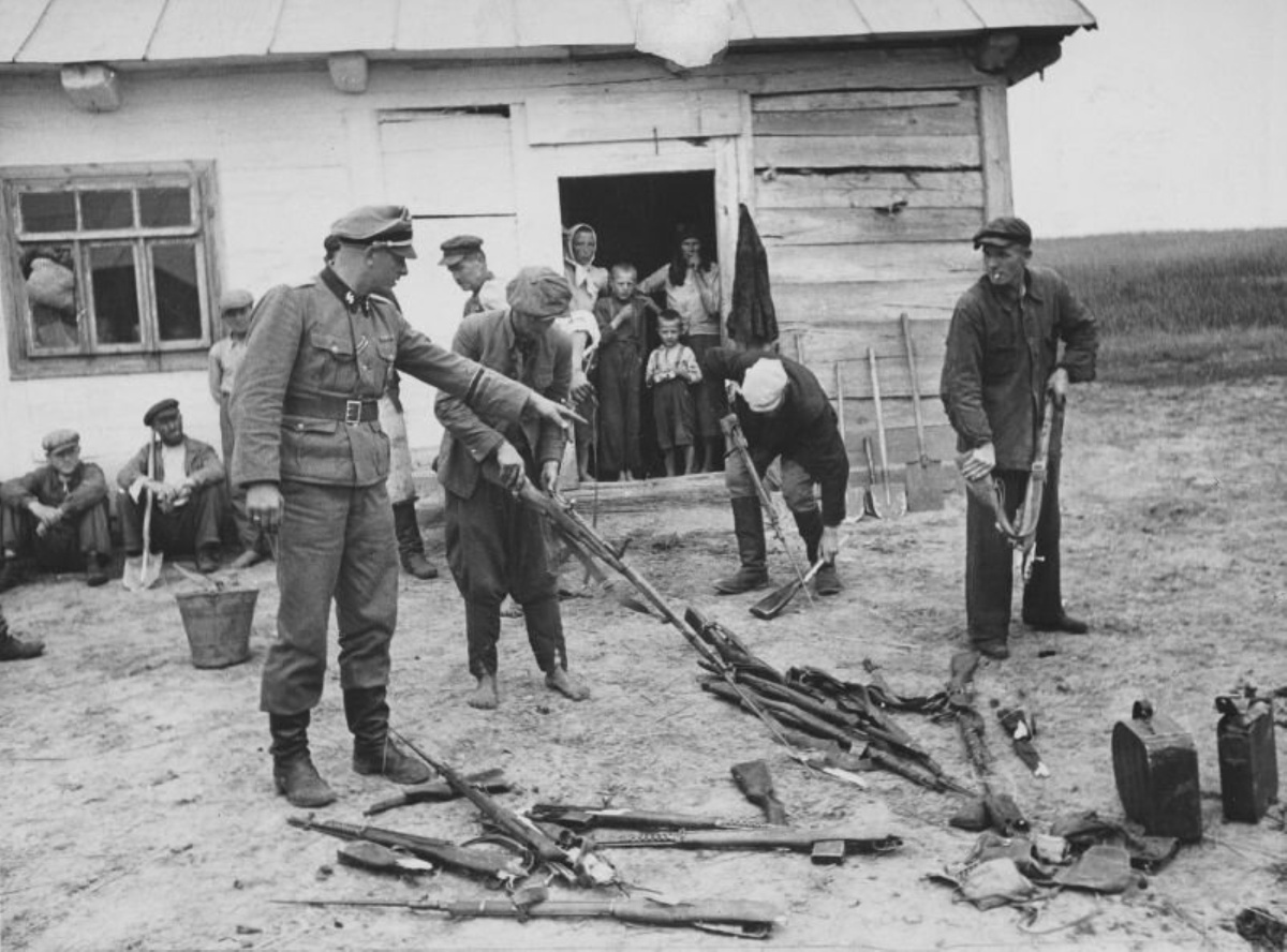 Эти кадры были сняты в самом начале Великой отечественной войны. 11 июля 1941 года в одной из оккупированных деревень разыгралась мрачная сцена. И она была зафиксирована на фото пленку. Под строгим надзором офицера полевой жандармерии СС местные жители были вынуждены ломать собранные советские винтовки. На первый взгляд ничего необычного. Оккупанты нередко заставляли мирных жителей действовать в своих интересах. Но стоит обратить внимание на мужчину в светлой кепке и тёмном пиджаке. В руках он держит патронные ящики, вероятно, от пулемёта «Максим». Этого человека ведут за пределы деревни. Несложно догадаться, что с ним произошло некоторое время спустя. На одном из фото его конвоируют в поле. Дальше всё понятно. Скорее всего, причиной трагедии стал обнаруженный фельд‑жандармами тайник с оружием. Мужчину в светлой кепке, вероятно, назначили виновным — и наказание последовало незамедлительно. Мы не знаем его имени. Есть лишь фото, сделанное нацистом. Эти кадры запечатлел военный корресп