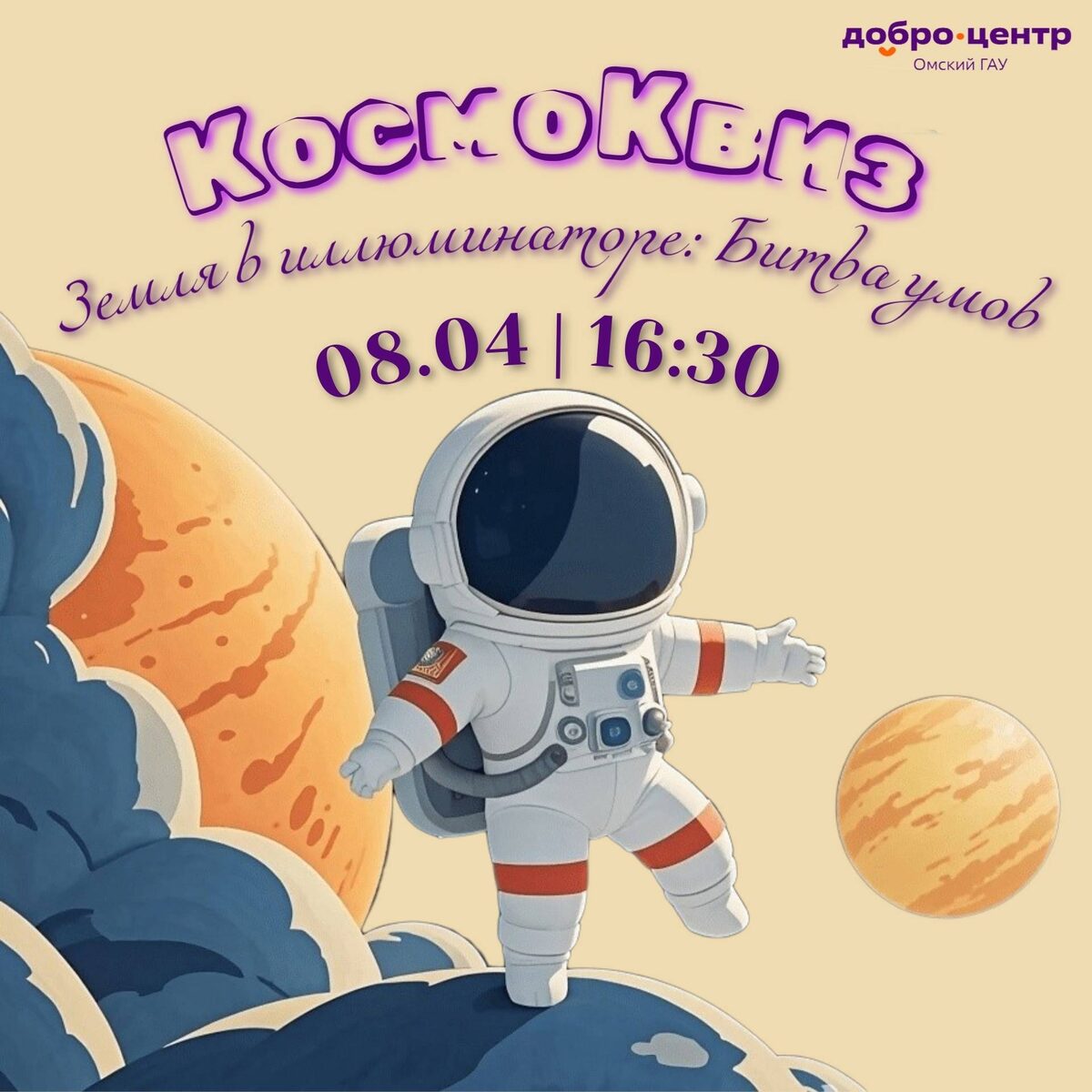 Интеллектуальная битва ко Дню космонавтики с пятью увлекательными раундами. Проверьте эрудицию в компании единомышленников. Начало: 08 апреля 2026 16:30 Стоимость: 150.0 руб. Адрес: г Омск, Сибакавская, 16к1 Организатор: https://vk.com/public141925584 🚀КосмоКвиз: Земля в иллюминаторе: Битва умов 🌍 Дорогие друзья! Приглашаем вас стать участниками интеллектуальной битвы, приуроченной ко Дню космонавтики. Квиз пройдет 8 апреля в 16:30 в Центре молодежных инициатив. 🌟Вас ждут пять увлекательных раундов: космические горизонты, тайны Вселенной, здоровье на орбите, проверка мифов, а также музыкальный батл, где нужно вспомнить строчки из известных песен о космосе. Это шанс блеснуть эрудицией, отлично провести время в компании единомышленников и открыть для себя... #познавательное_развлечение_квиз Узнать подробности, адрес или записаться на событие.