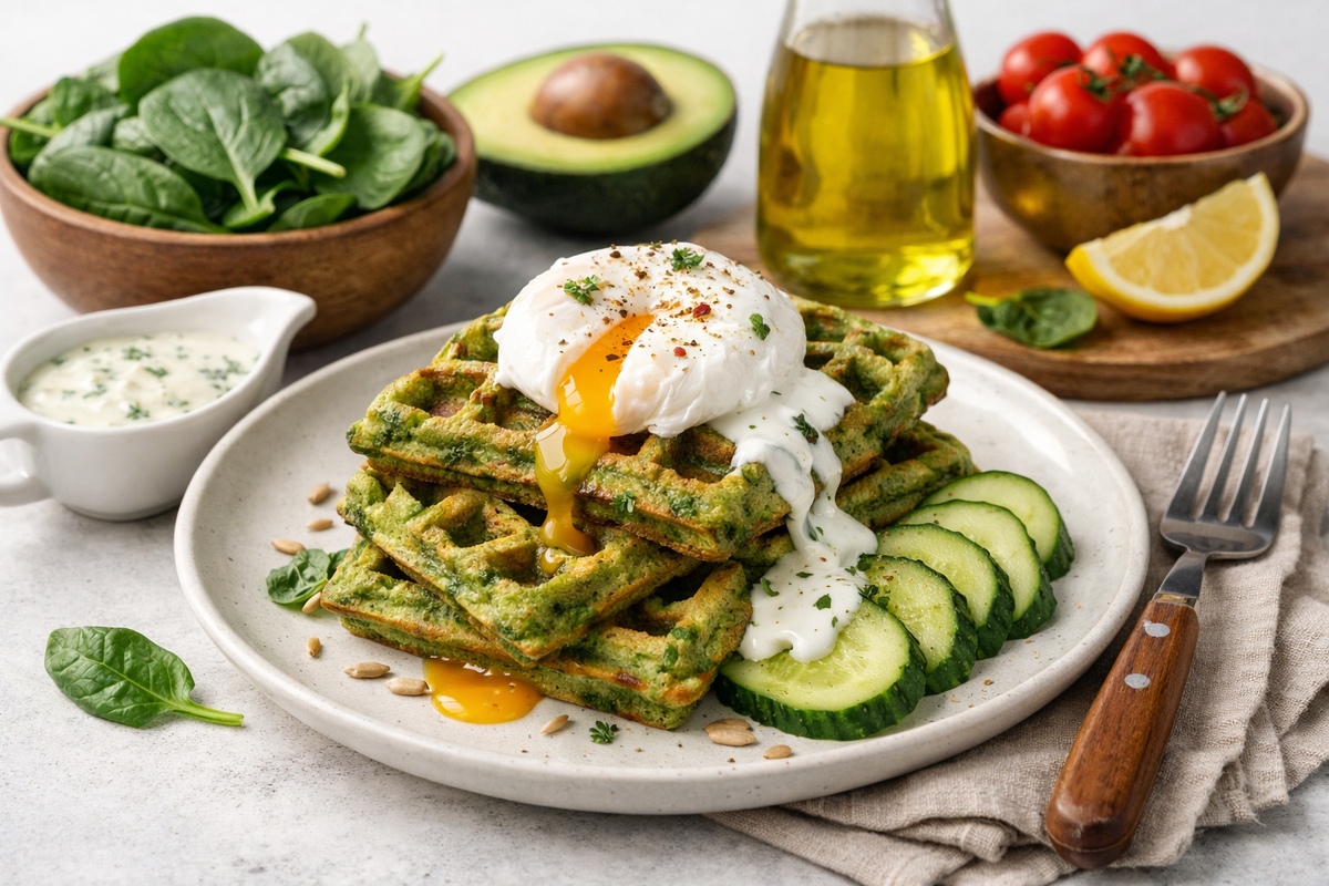 Иногда завтрак хочется сделать не просто полезным, а таким, чтобы он действительно радовал с первой вилки. Эти вафли со шпинатом как раз из таких вариантов. Они получаются мягкими внутри, с аппетитной корочкой снаружи, а в паре с яйцом, хрустящим огурцом и быстрым соусом превращаются в тот самый завтрак, который хочется повторять снова и снова. Смотрится красиво, готовится просто, а на вкус намного интереснее обычных тостов и каши.