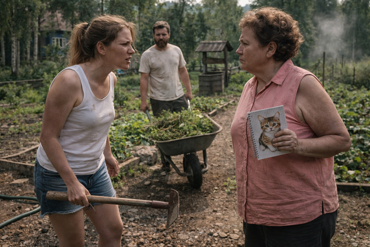 — В моем блокноте четко записано: полив моркови и кабачков — с шести до полседьмого, пока солнце не зажарило воду прямо на листьях! — дверь распахнулась без стука, и свекровь застыла на пороге, сжимая в руках свой легендарный талисман власти — тетрадку в клеточку с котенком на обложке.