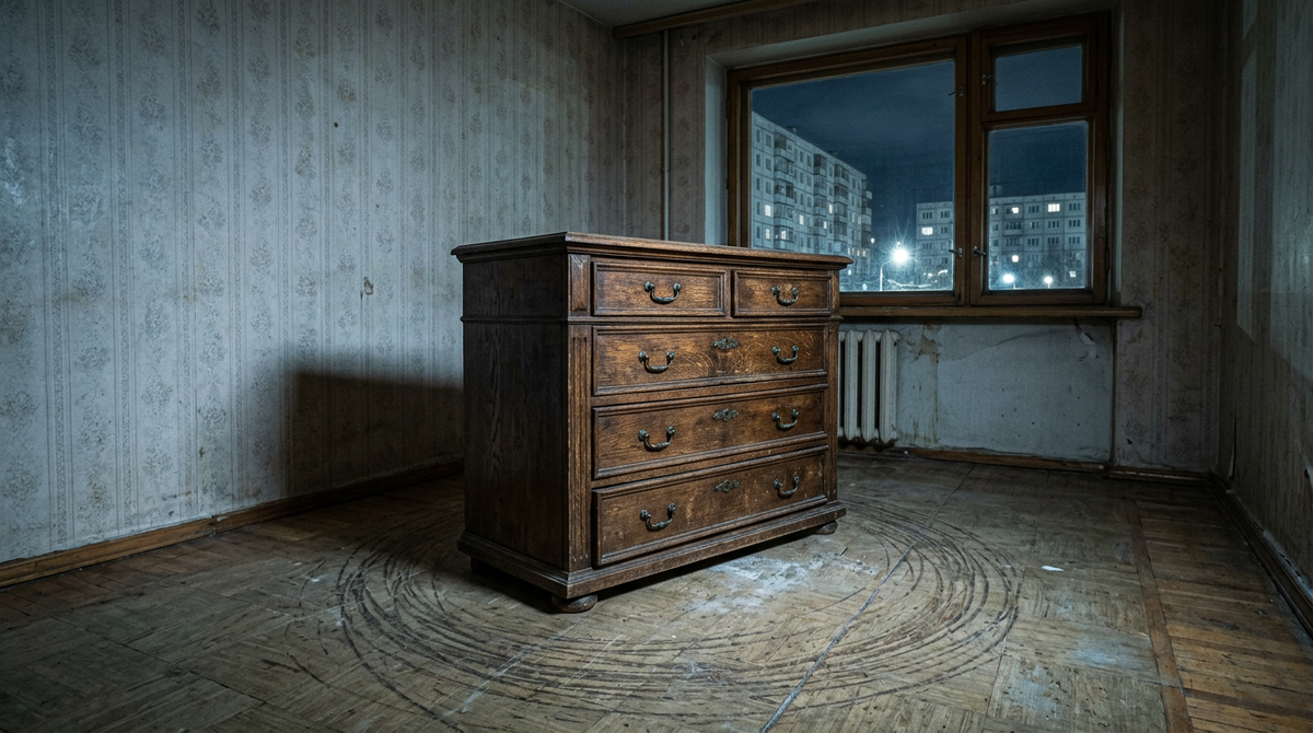 И — в центре комнаты — тяжёлый дубовый комод. Старый, массивный, с бронзовыми ручками. Килограммов восемьдесят. На полу — следы. Глубокие царапины — полукругом, от стены до стены. Следы комода. Она двигала его — каждую ночь — по кругу.