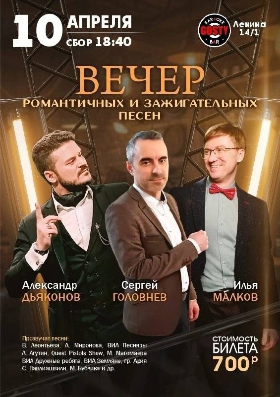 Три харизмы. Одна сцена. Вечер контрастов с трогательной романтикой и зажигательным драйвом. Коллекция хитов от 60-х до нулевых, объединяющая поколения. Начало: 10 апреля 2026 18:40 Стоимость: 500.0 руб. Адрес: г Омск, Ленина, 14/1 Организатор: https://vk.com/public131749131 Три голоса. Три харизмы. Одна сцена. Представьте: сцена, софиты и трое мужчин, чьи голоса и обаяние завораживают с первых аккордов. Это вечер контрастов, где соседствуют трогательная романтика и зажигательный драйв. Мы собрали для вас коллекцию хитов, проверенных временем: 🕰 От «Twist» 60-х 🎸 До гимнов любви 90-х и нулевых. Позвольте себе отвлечься от суеты и окунуться в атмосферу музыки, которая объединяет поколения. 📅 Ждем вас 10 апреля в 18:40 📍 Караоке & бар GOSTY, Ленина 14/1 🎟 Бронируйте столики / билеты... #развлечения_современная_музыка Узнать подробности, адрес или записаться на событие.