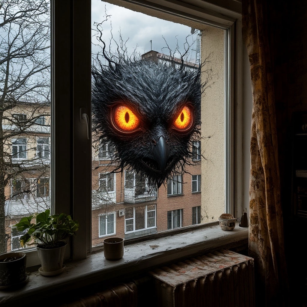 Тёмный человек с рыбьими глазами стоял под фонарём — неподвижный, будто вырезан из ночи. Его силуэт тонул в тени капюшона, но глаза… выпуклые, с вертикальными зрачками, они светились в темноте, как два холодных огонька. Он смотрел прямо на Алексея, стоявшего у окна в своей квартире.