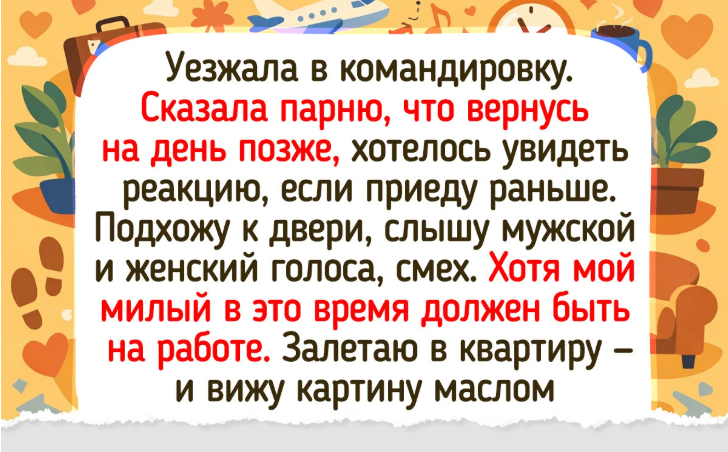 - Уезжала в командировку. Сказала парню, что вернусь на день позже, хотелось увидеть реакцию, если приеду раньше. Подхожу к двери, слышу мужской и женский голоса, смех. Хотя мой милый в это время должен быть на работе. Залетаю в квартиру — и вижу картину маслом: мои родители играют в приставку. Парня нет — он на работе. Оказалось, родители предупредили его, что зайдут забрать какие-то вещи, попросили оставить ключи. Ну и решили воспользоваться моментом и поиграть, пока никого нет — я ведь обычно работаю дома.