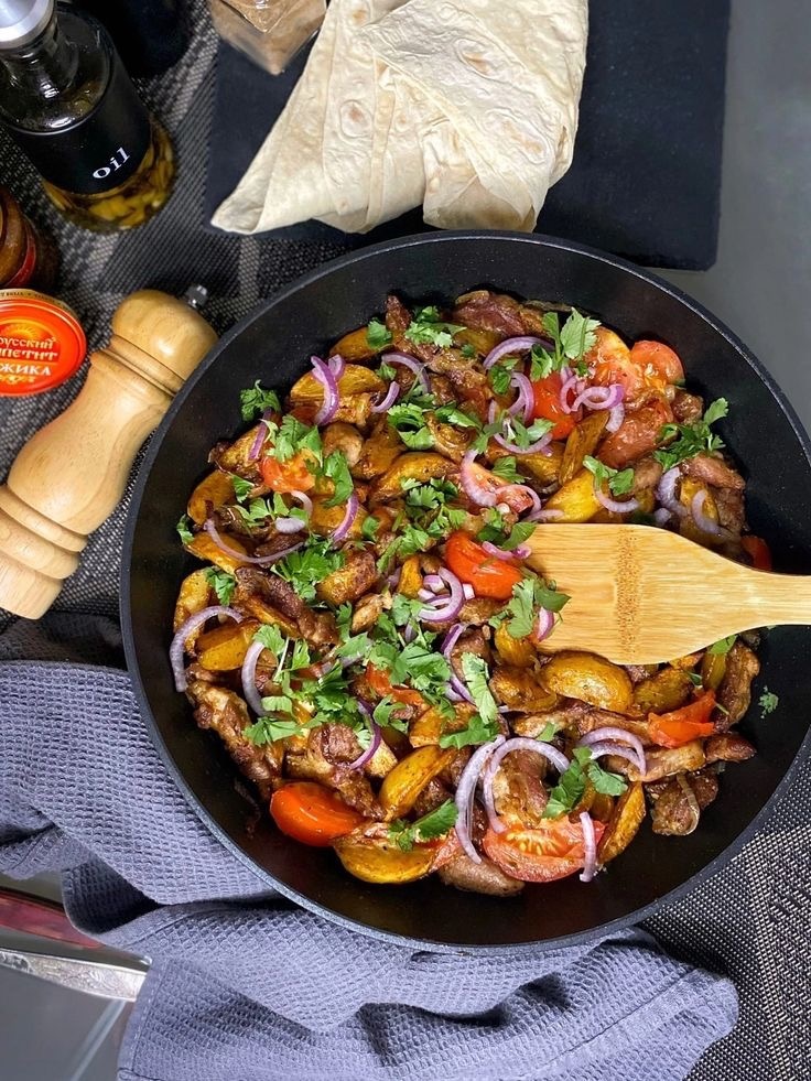 3. Сборка: В форму для запекания выложи слоями: картошка → мясо → лук с перцем → кружки помидоров (дольки)сверху. Посыпь рубленой кинзой, базиликом и хмели-сунели.