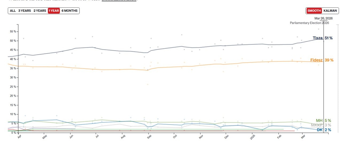 Произошло это в основном благодаря тому, что две маленькие оппозиционные партии, имеющие непроходные проценты, снялись с выборов чтобы помочь Мадяру и его «Тисе» победить, это обеспечило буст примерно на 3%, хотя Орбан после кризиса осени 2025 года рейтинг отыгрывал. Есть и другая проблема, ультраправая партия, которая традиционно выступает союзником Орбана — а значит их проценты можно было просто плюсовать — и которая имела довольно стабильные проходные 6%, за последние недели упала до 4-5%, так что её прохождение не гарантировано. В то же время опросы в Венгрии не являются реальным показателем рейтингов. Они строго поделены на оппозиционные и провластные, каждый сейчас рисует лидером своих. Но при этом на прошлых выборов результат оппозиционных опросов разошёлся с реальностью на безумные 10% и более. Тогда в лидерстве партии Орбана никто не сомневался, но например, центр IDEA предрекал преимущество в 5%, тогда как на выборах оно составило 16,3%. Кроме того ни один опрос не показал,