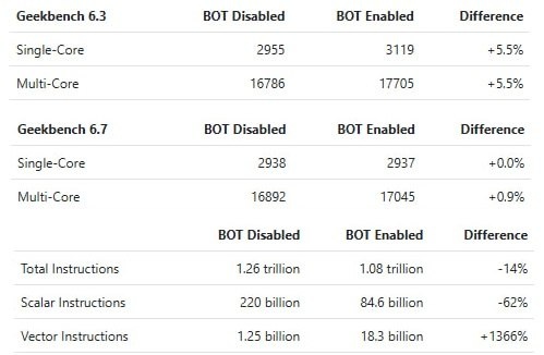 ). После тестов выяснилось, что технология распознаёт конкретные приложения и изменяет их поведение перед запуском. По данным Primate Labs, BOT вычисляет контрольную сумму исполняемого файла и применяет заранее подготовленные оптимизации. Это объясняет разницу между версиями теста — в Geekbench 6.3 прирост составил около 5,5%, а в 6.7, где сигнатура изменилась, эффект почти исчез. То есть BOT фактически перестраивает код под конкретную архитектуру CPU, но только для ограниченного списка программ. Проблема в избирательности. Пока BOT работает лишь с несколькими приложениями и играми, такие оптимизации искажают бенчмарки — система выглядит быстрее в тестах, чем в реальной нагрузке. В Geekbench 6.7 добавят детектирование BOT, а старые результаты пометят предупреждением.